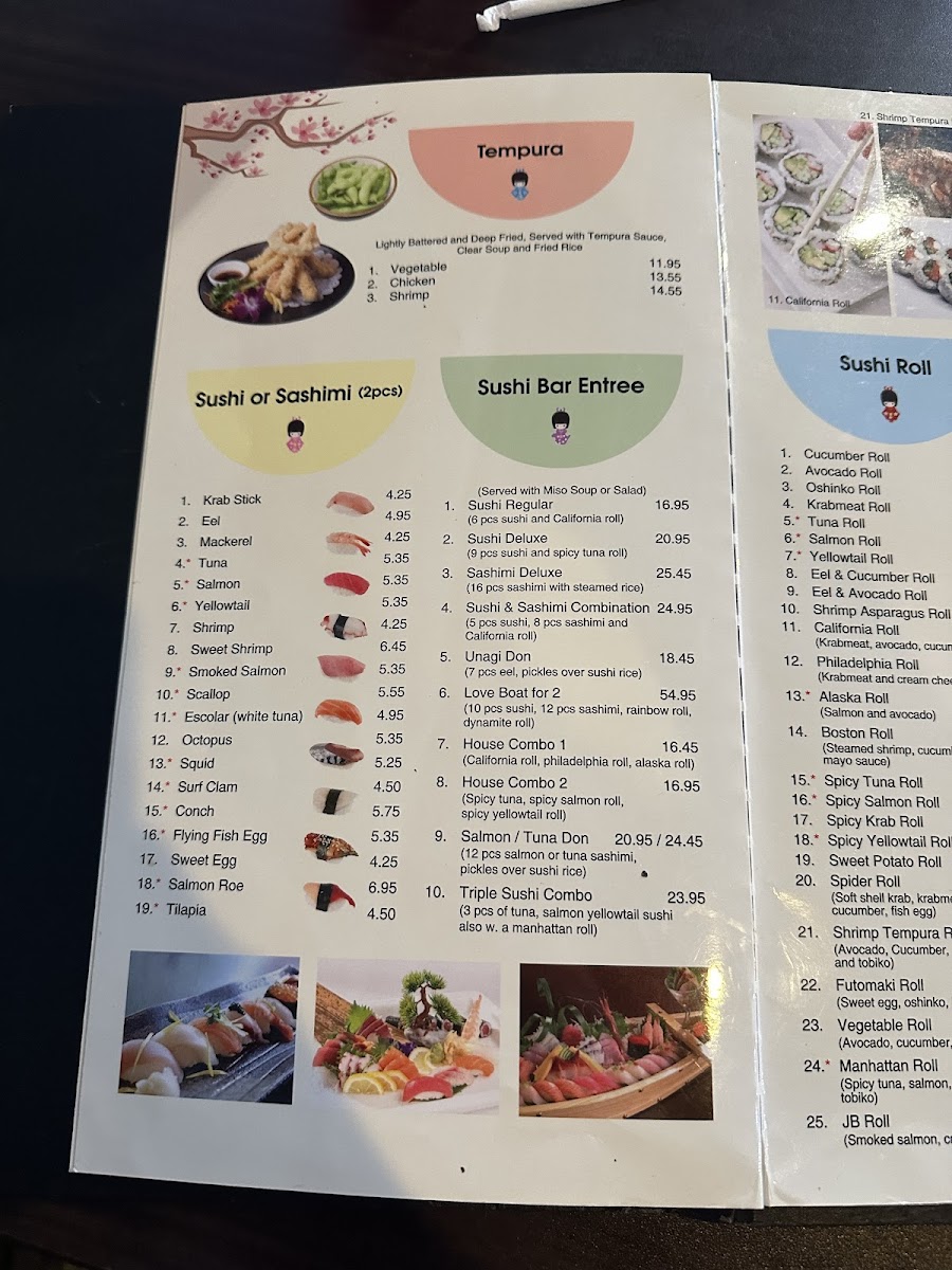 Salmon, white fish, krab, cream cheese, avocado on inside. Deep fried w. eel sauce, masago, scallion and sesame on top