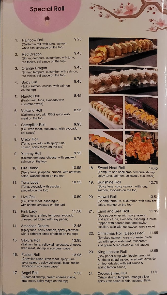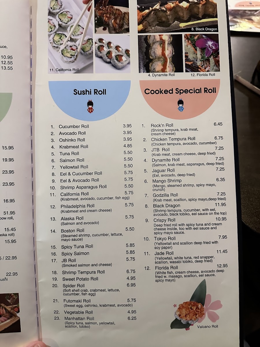 Tempura soft shell crab, tempura shrimp, spicy tuna, salmon, yellowtail, cucumber.
